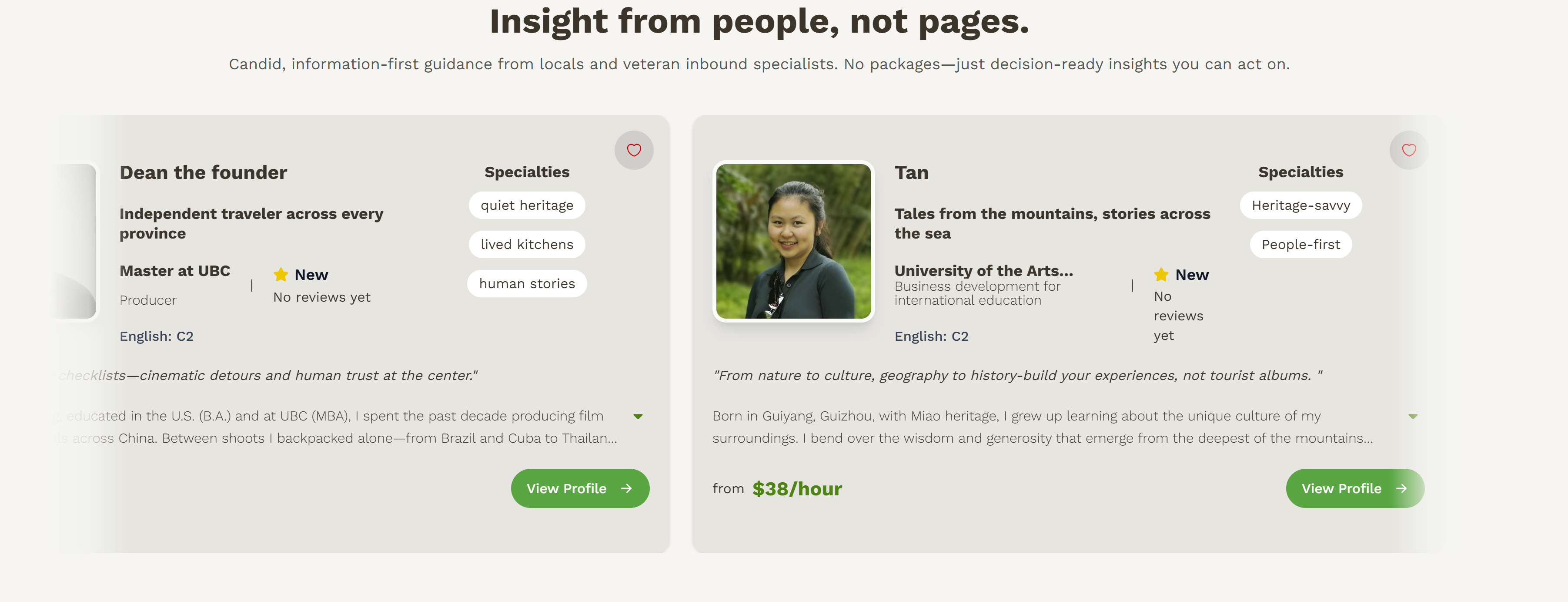 1:1 Consultation with Local Experts: Once you have some ideas (whether from the Journey Generator or your own research), you can book a one-on-one video consultation with a vetted local travel specialist. These are English-speaking experts who have lived experience in China and a passion for sharing genuine insights. In a live video call (usually 60+ minutes), you can ask anything – from refining your itinerary and finding transport connections to cultural etiquette and offbeat recommendations. There are no chatbots or call-center scripts here; it’s a real human who gives candid, information-first guidance tailored to you. No pushy tour packages, just straight answers that help turn your tentative plan into a confident itinerary. As one consultant puts it, “people first, route second... it is never about checking boxes on a list, but about finding the right pace and detail that make a place interesting.” This philosophy means your trip will be designed for experience and depth, not just rushing through tourist traps.